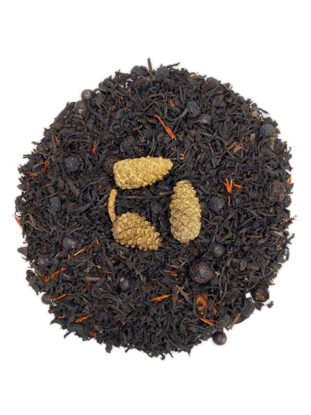 Сочетание крупнолистового индийского черного чая с ягодами можжевельника, черной смородины и черноплодной рябины дают незабываемое удовольствие и ощущение бодрости. А лепестки сафлора и сушеные шишки подчеркивают легкость и свежесть напитка.