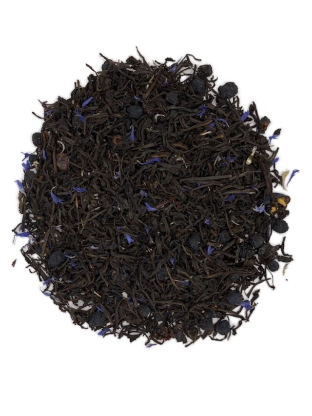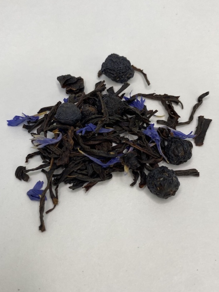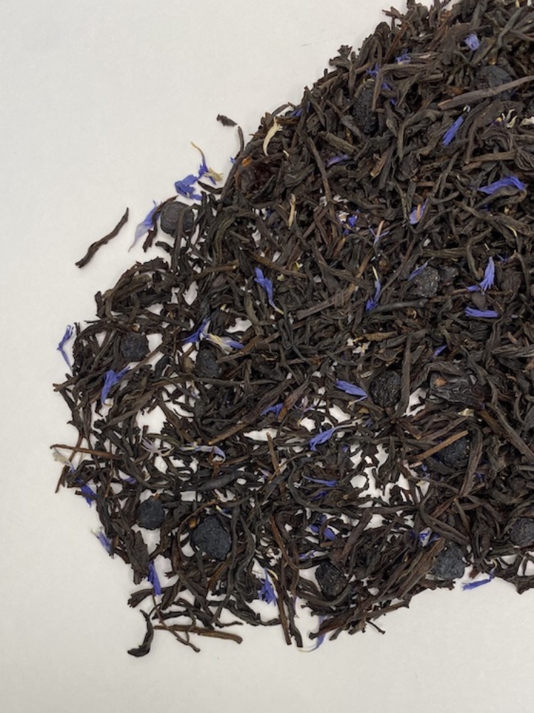Это цейлонский чай с добавлением цедры шиповника, ягод аронии, украшенный лепестками василька.