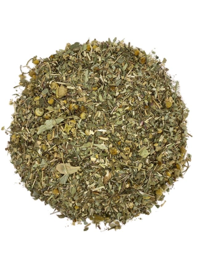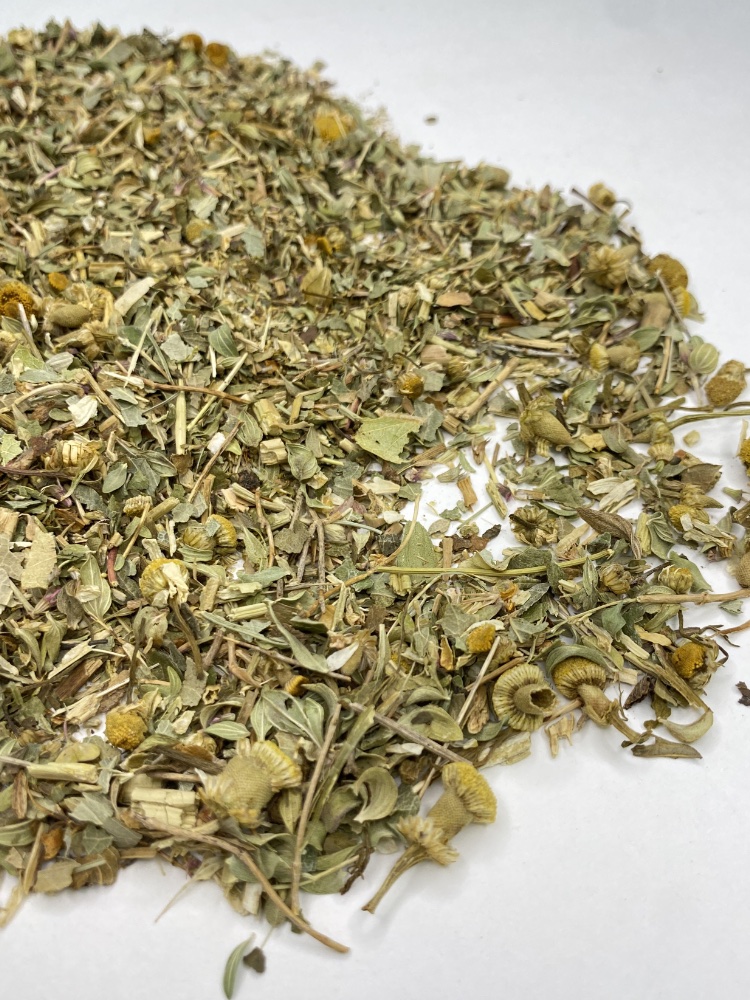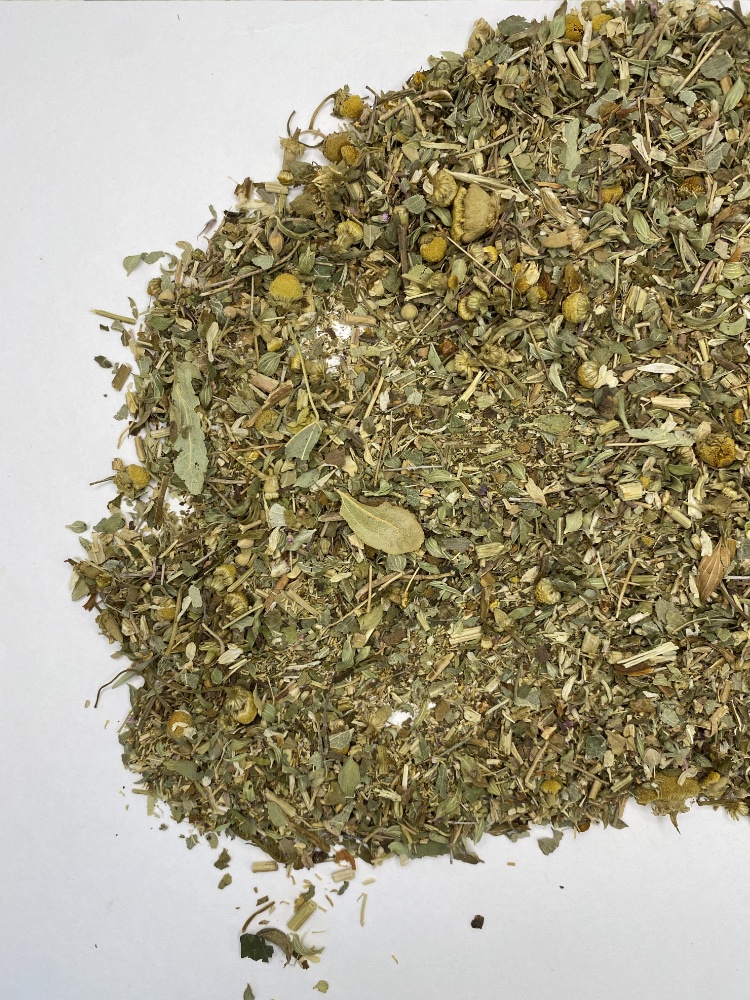 Травяной напиток, состоящий из листьев чабреца, цветков ромашки, липы, рубленного листа клубники и мелиссы.