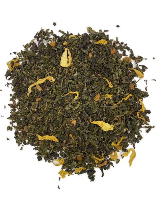 Это высокогорный китайский чай Те Гуаньинь, в основу которого входят лепестки подсолнечника и цукаты персика.
