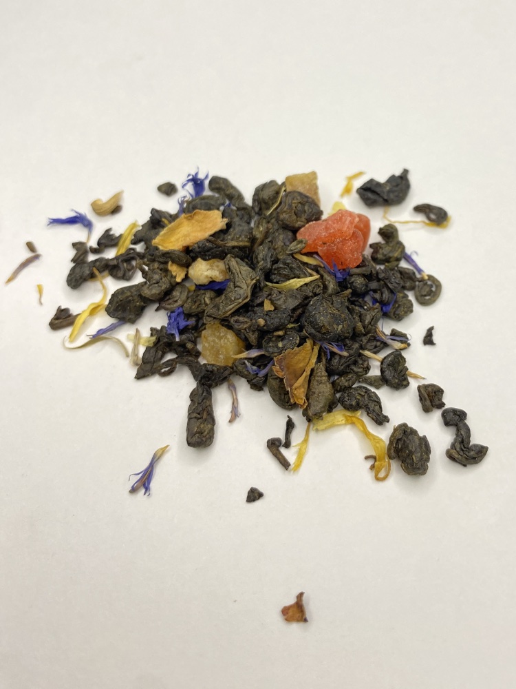 Это зеленый чай Ганпаудер с летним ароматом тропических фруктов манго и маракуйя, с лепестками розы, календулы, василька и с кусочками тропических фруктов.