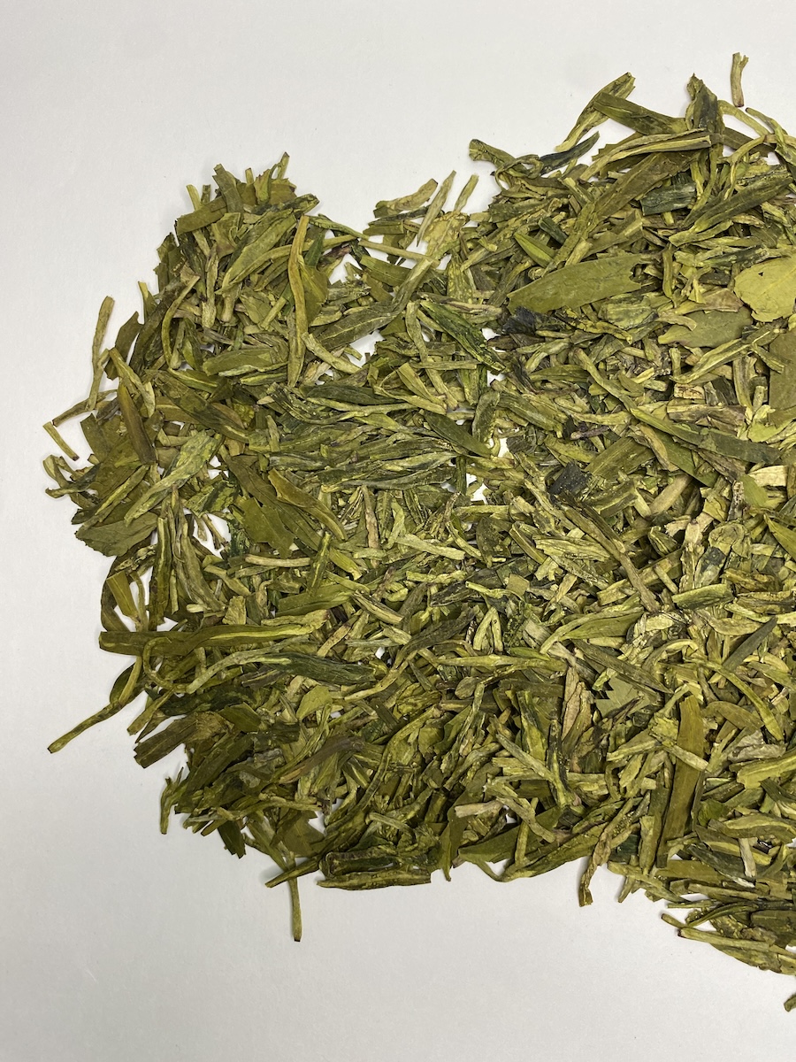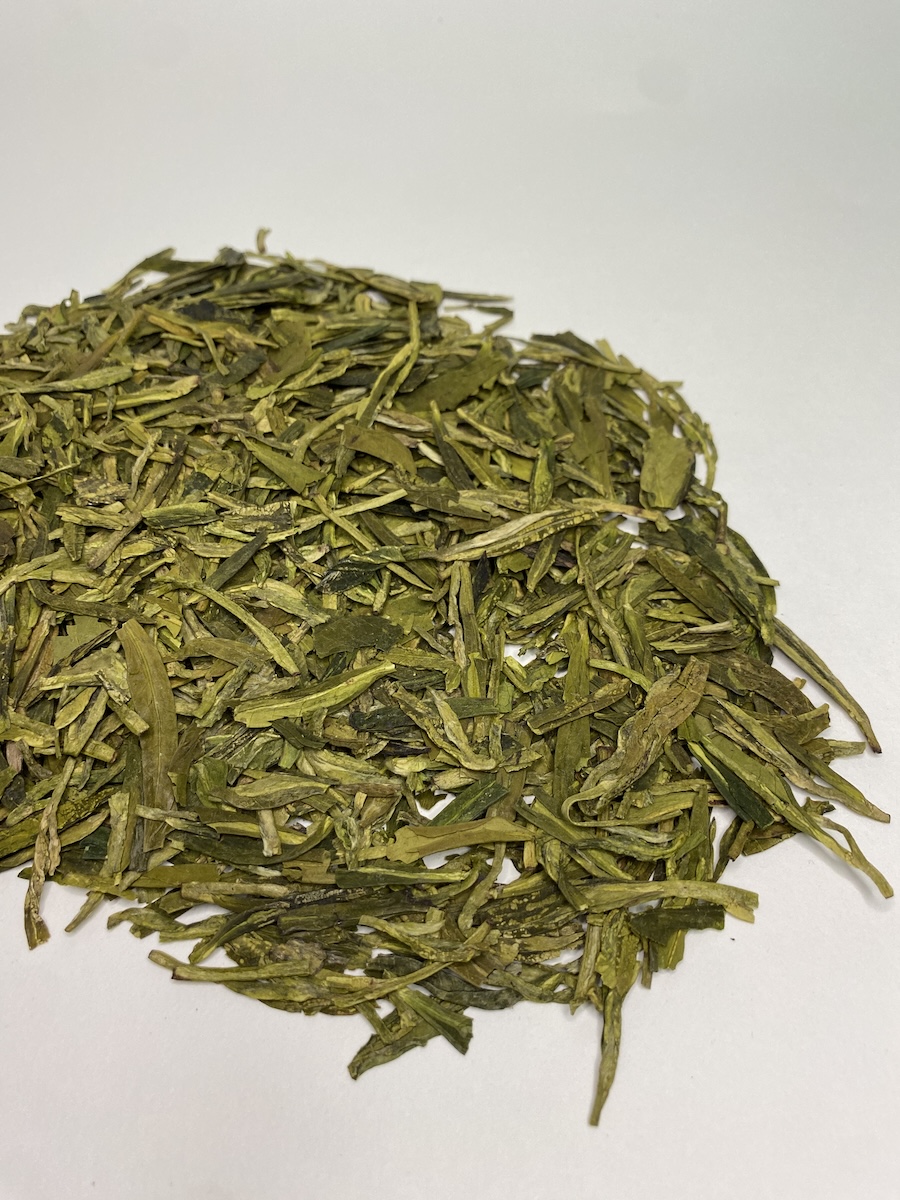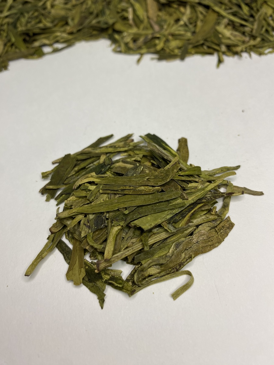 Данный Лун Цзин из провинции Чжэцзян, весеннего сбора, 4-7-го сортов, степень ферментации незначительная (около 10%), лист ярко-зеленый, с отдельными желтоватыми прожилками.